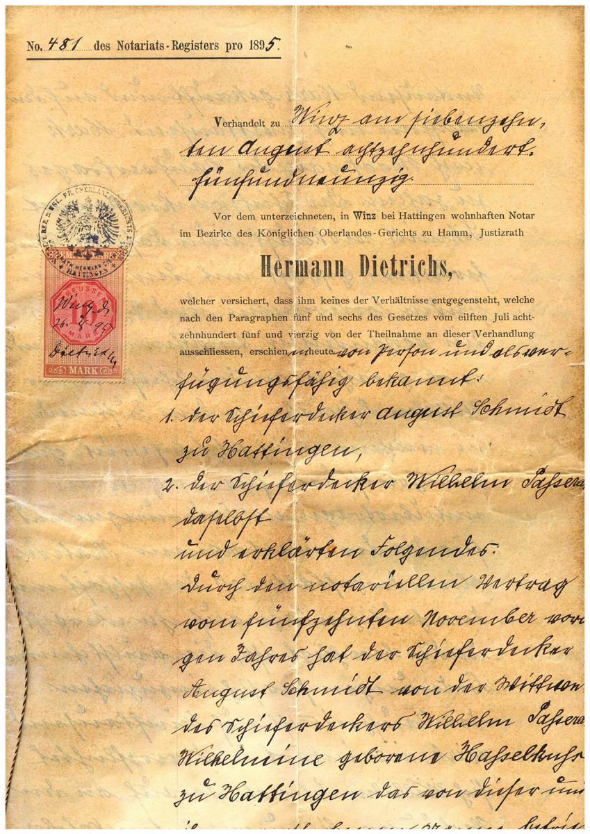 | 13.09.1867 | Gründung der Dachdeckerfirma durch die Schieferdeckermeister Passerah am Flachsmarkt in Hattingen | |