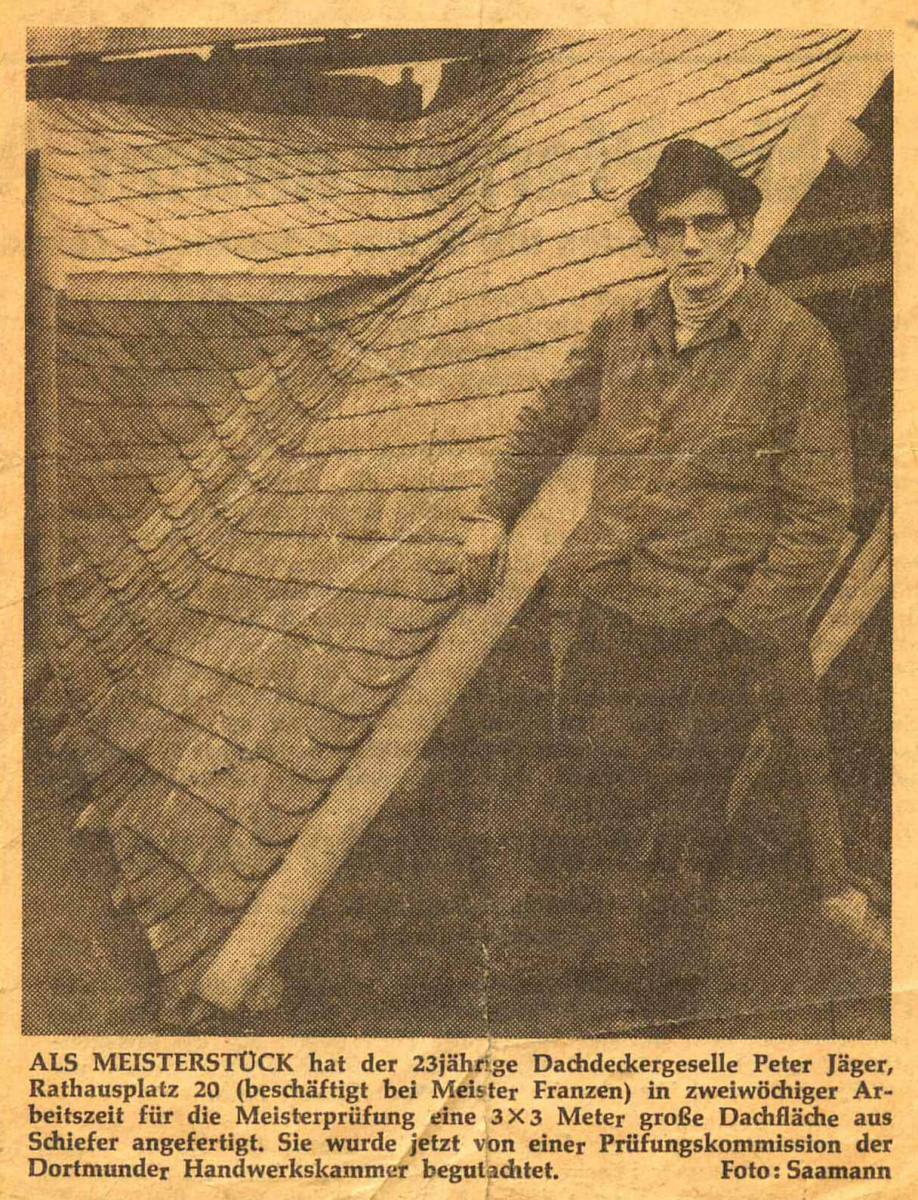 | 1971 | Abschluss Meisterbrief von Peter Jäger. Der Firmenstandort ist nun in der Bismarckstraße in Hattingen | |